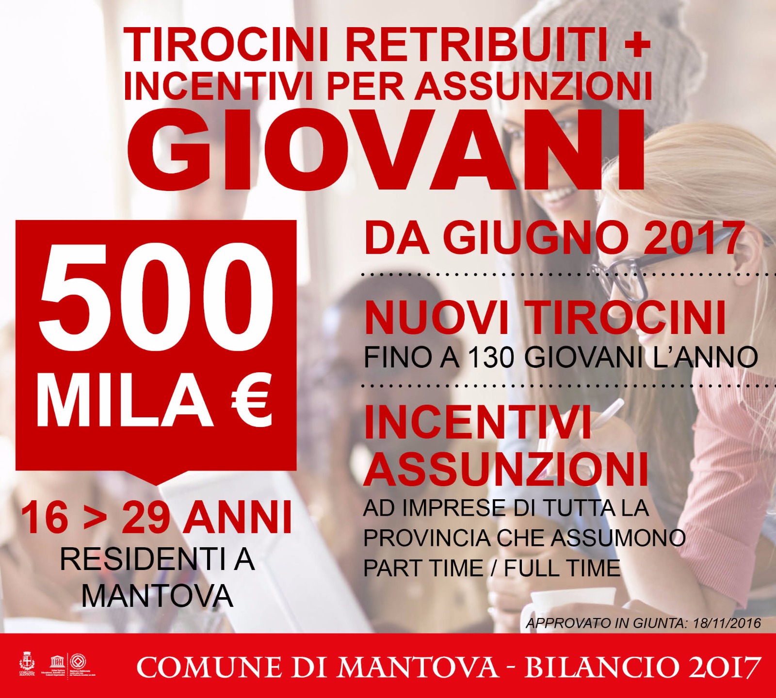 In arrivo altri 18 milioni del bando periferie e i 9 milioni per il Palazzo del Podestà. Nel 2017 prenderà il via anche il progetto riservato ai giovani dai 16 ai 29 anni. La Giunta, anche se il Comune non ha competenze dirette, ha messo a disposizione 500mila euro da investire in tirocini formativi retribuiti e in incentivi all'assunzione di giovani residenti a Mantova in realtà di tutta la provincia. "In dicembre verrà convocato un tavolo di lavoro con i rappresentanti delle imprese, del terzo settore, degli ordini professionali, dei lavoratori e di tutto l'arco politico per costruire la misura nelle sue regole - ha sottolineato Palazzi – in modo da far decollare l'esperienza nel mese di giugno". "E' questo il nostro impegno per combattere la disoccupazione giovanile e mi auguro che l'intervento diventi strutturale anche nel futuro – ha aggiunto Palazzi - Spero che tali misure vengano votate da tutti".