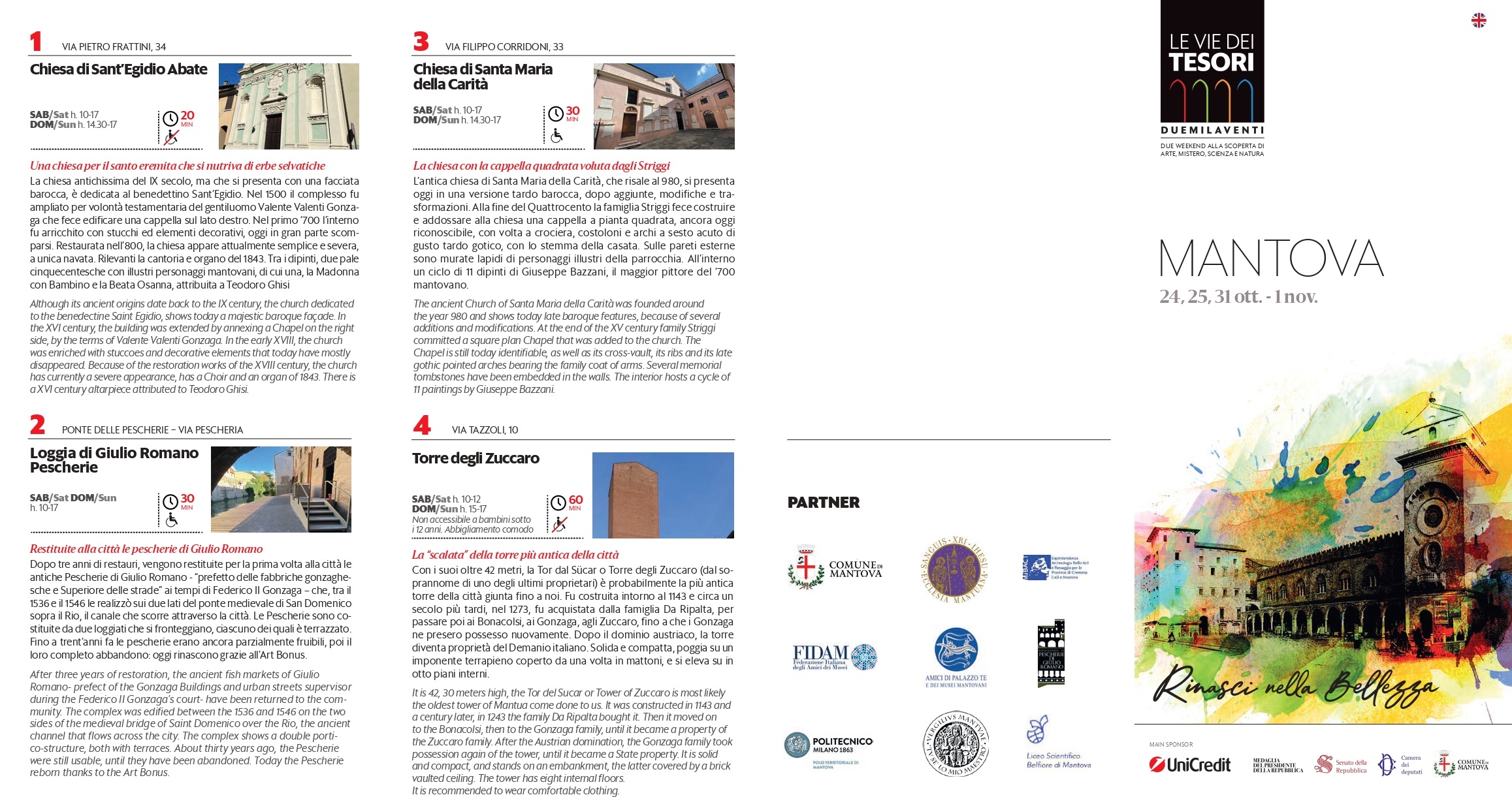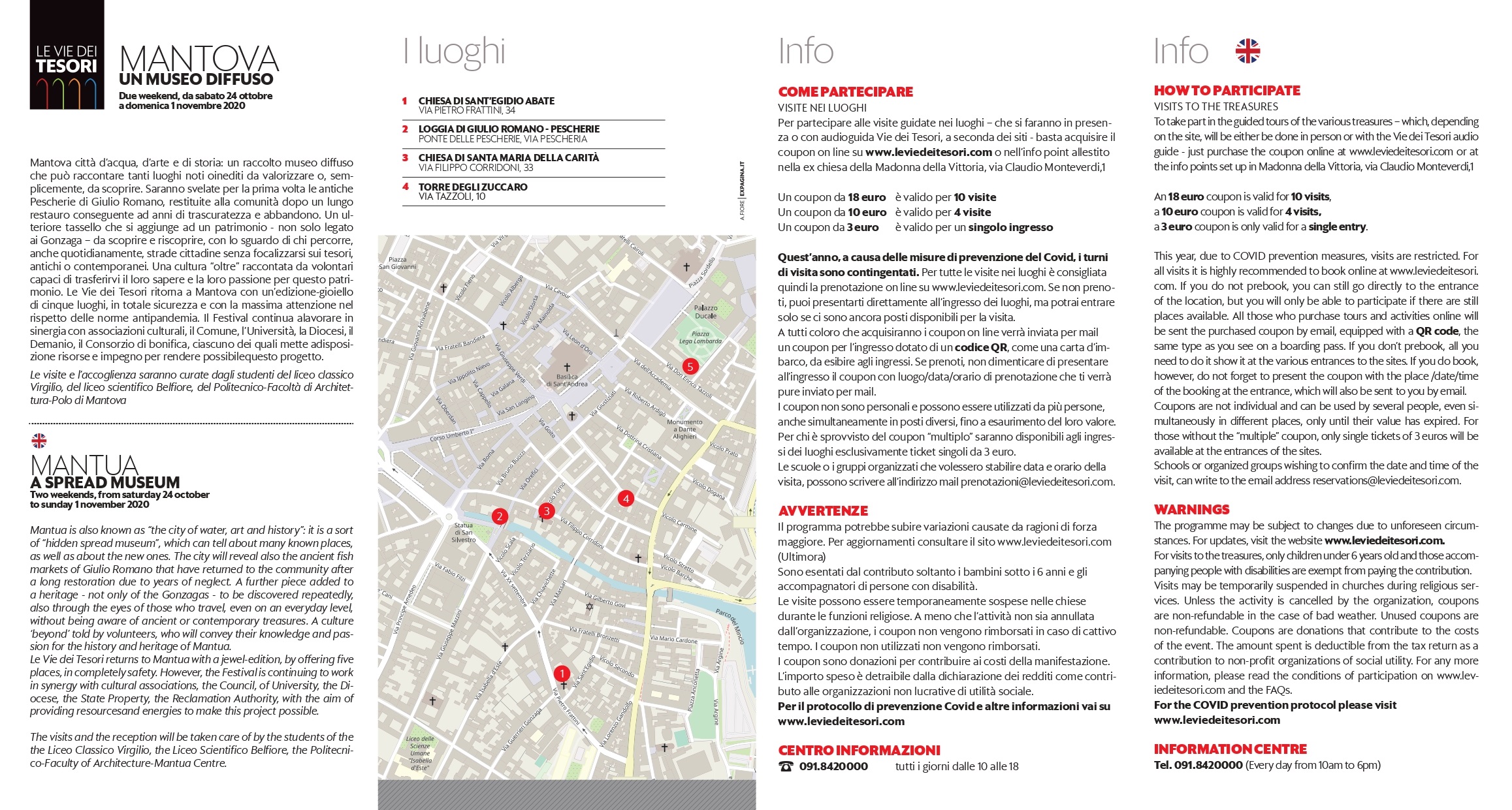 Tutto parte dalla convinzione che i tesori delle città siano un patrimonio condiviso, e che è ancor più nei momenti di crisi che da qui bisogna ripartire come luoghi di riconoscimento della comunità, di tenuta sociale, seppure senza i bagni di folla degli anni scorsi, e nel necessario rispetto delle misure di prevenzione dell’epidemia. Per questo è stato messo insieme un programma ricco, denso e adeguato ai tempi, ma in piena sicurezza: il festival che ha sempre spinto verso modalità 4.0, oggi insiste e rilancia; prenotazione ovunque caldamente consigliata, presidi di sicurezza, distanziamento, acquisto dei coupon on line. Basta un coupon unico per accedere alle visite: all’ingresso di ogni sito, verrà smarcato e si accederà immediatamente alla visita, condotta dai volontari e dai ragazzi dagli studenti del liceo classico Virgilio, del liceo scientifico Belfiore, del Politecnico-Facoltà di Architettura-Polo di Mantova.