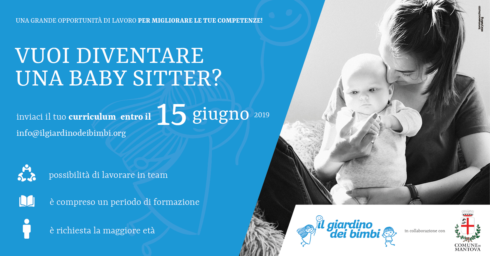La Società Cooperativa Sociale Onlus “Il Giardino dei Bimbi” di Mantova, in collaborazione con il Comune di Mantova – Settore Welfare, Servizi Sociali e Sport, sta selezionando aspiranti baby sitter da avviare ad un percorso di formazione finalizzato all’inserimento in un albo.