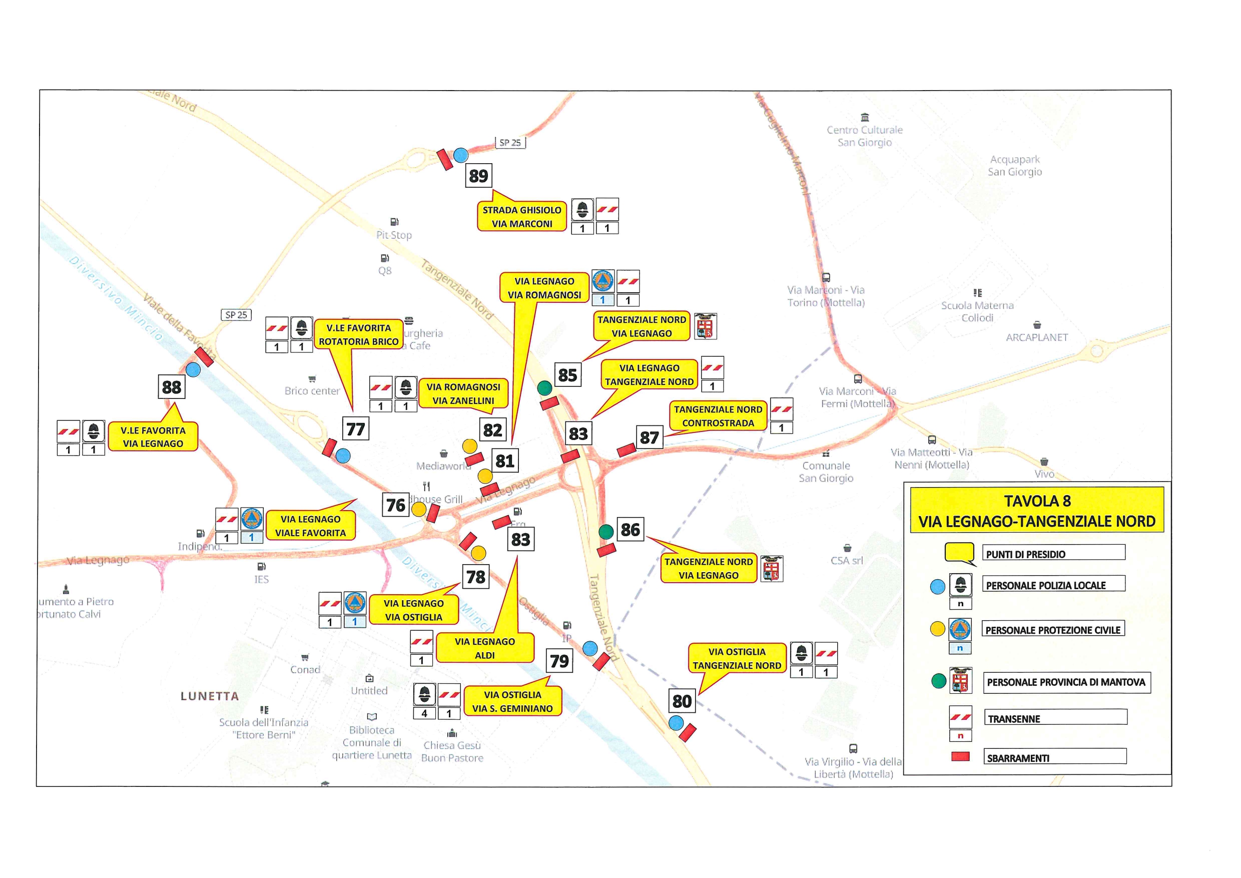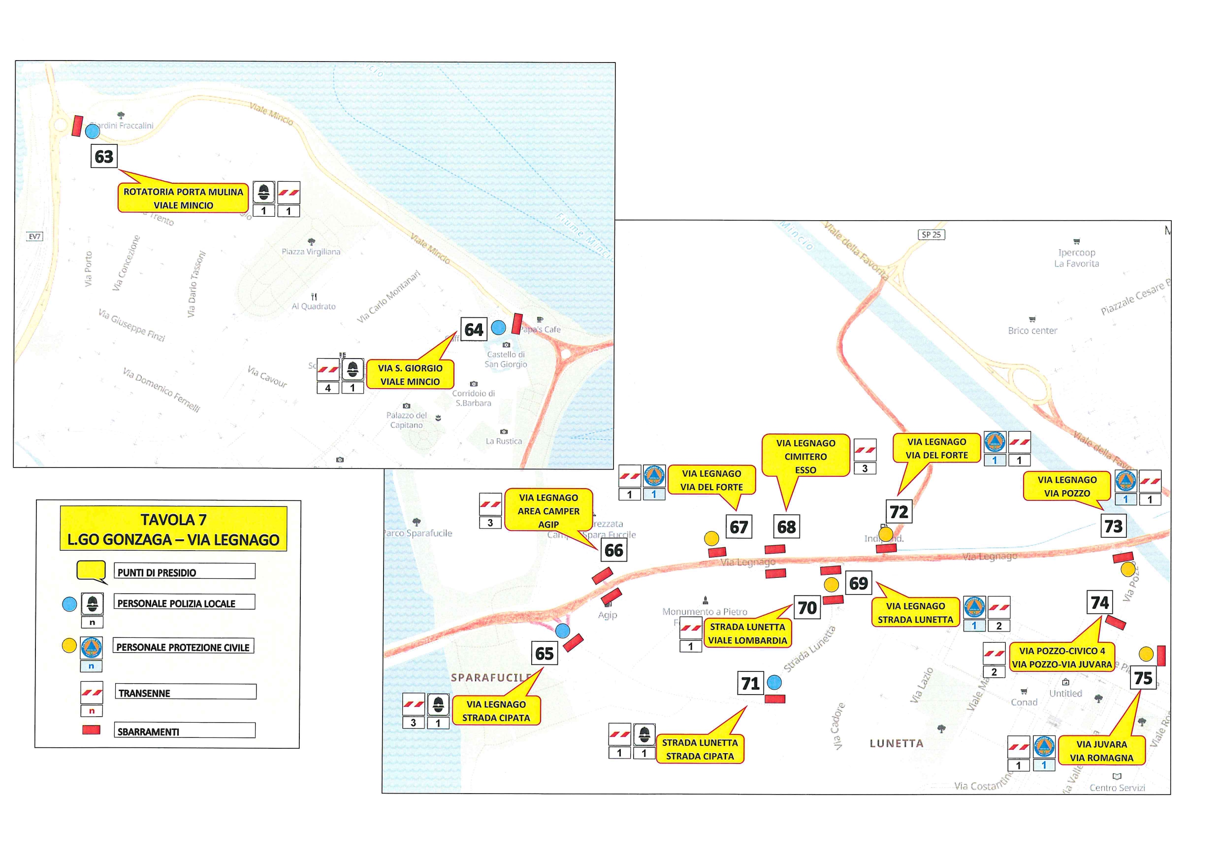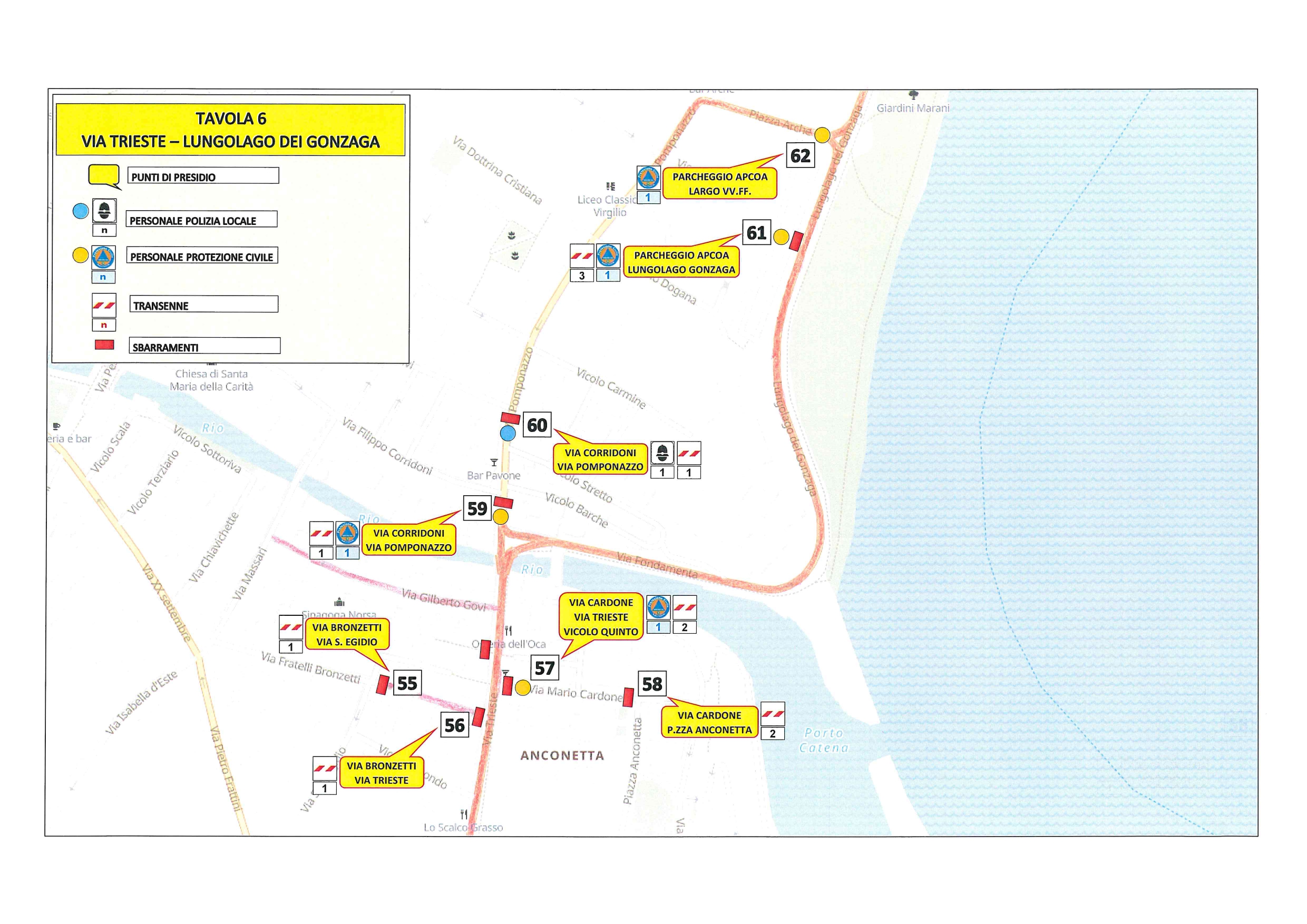Nelle tavole sottostanti si possono vedere nel dettaglio i punti di presidio, il personale impiegato, le aree transennate e gli sbarramenti.