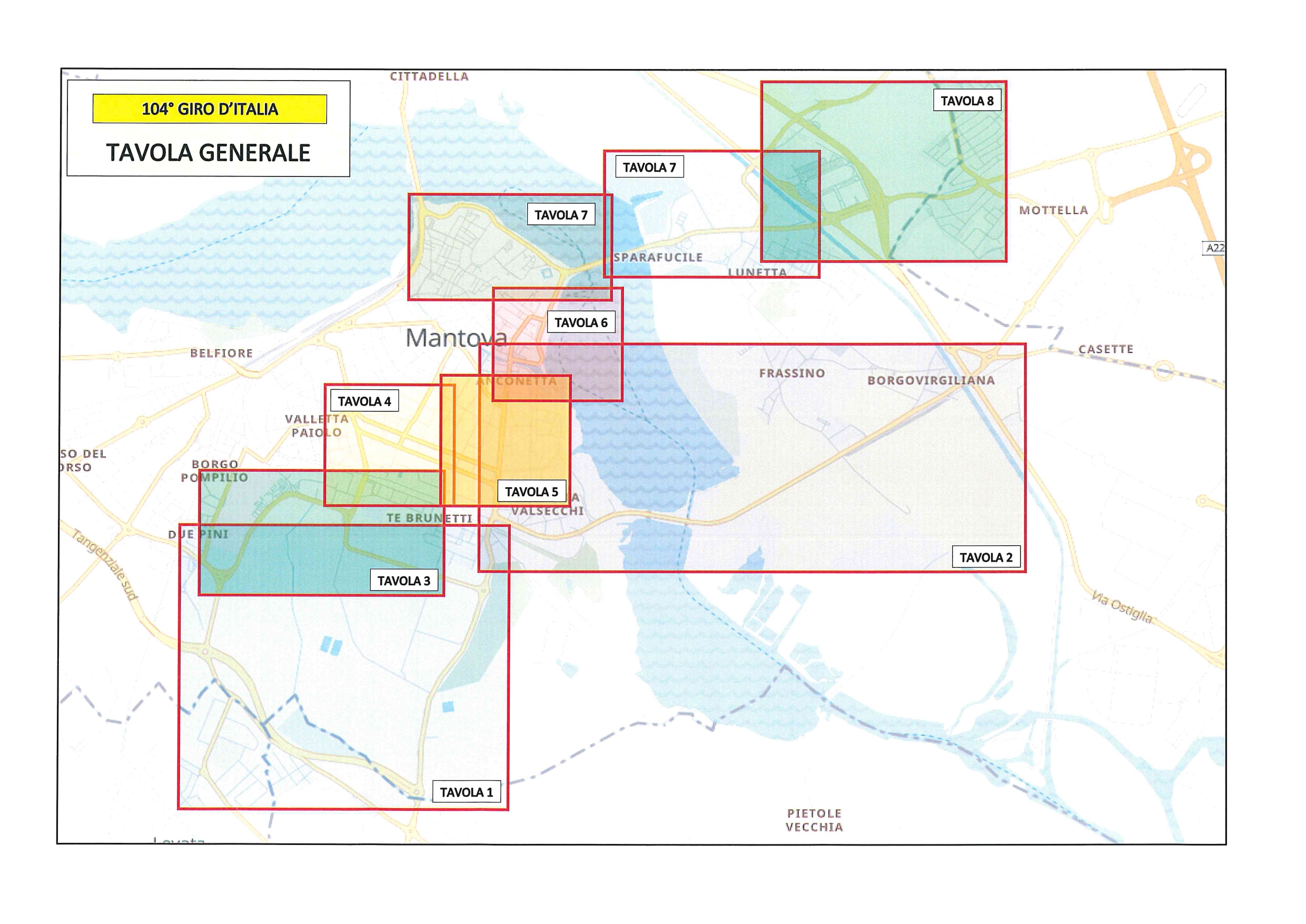 Il Giro d'Italia venerdì 21 maggio passerà per la città di Mantova. Il comandante della Polizia Locale Paolo Perantoni ha firmato al riguardo un’ordinanza che prevede la sospensione della circolazione dalle 12.30 alle 17 dei veicoli nelle vie interessate al percorso, vale a dire in via Donati, via Bellonci, viale Montello, viale Monte Grappa, viale Isonzo, piazzale di Porta Cerese, corso Garibaldi, via Trieste, via Fondamenta, Lungolago dei Gonzaga e via Legnago. Scatterà anche il divieto di sosta, con rimozione coatta, in corrispondenza dei parcheggi di viale Monte Grappa (escluso il tratto dal civico 24 al civico 10), viale Isonzo, via Fondamenta e via Legnago dalle 8 alle 18, in corso Garibaldi e via Trieste dalle 10 alle 18, in via Donati, viale Montello e viale Monte Grappa (compreso il tratto dal civico 24 al civico 10) dalle 12 alle 18. Dalle 12.30 alle 17 verrà anche modificata la circolazione nelle strade che sbucano sul percorso, comprese via Parma e il tratto extraurbano di via Legnago.