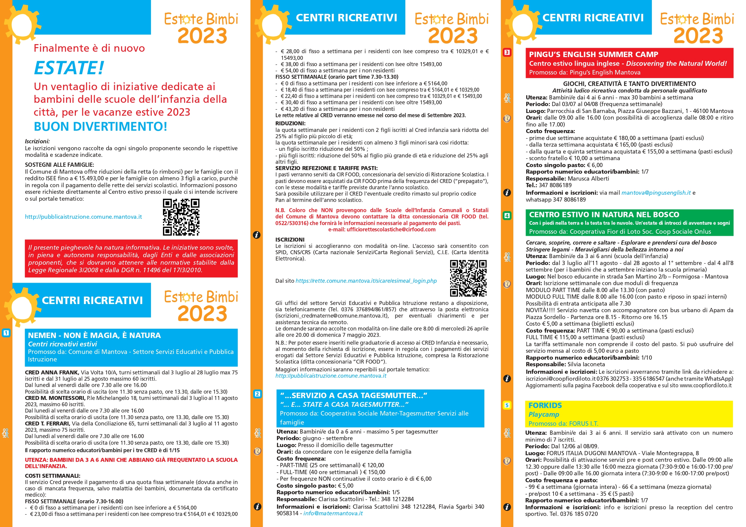 Il Comune di Mantova ha predisposto il programma dei Cred Infanzia dai 3 ai 6 anni. Pubblichiamo tutte le informazioni utili per conoscere le proposte riguardanti il 2023. In fondo alla pagina è possibile anche scaricare la brochure.